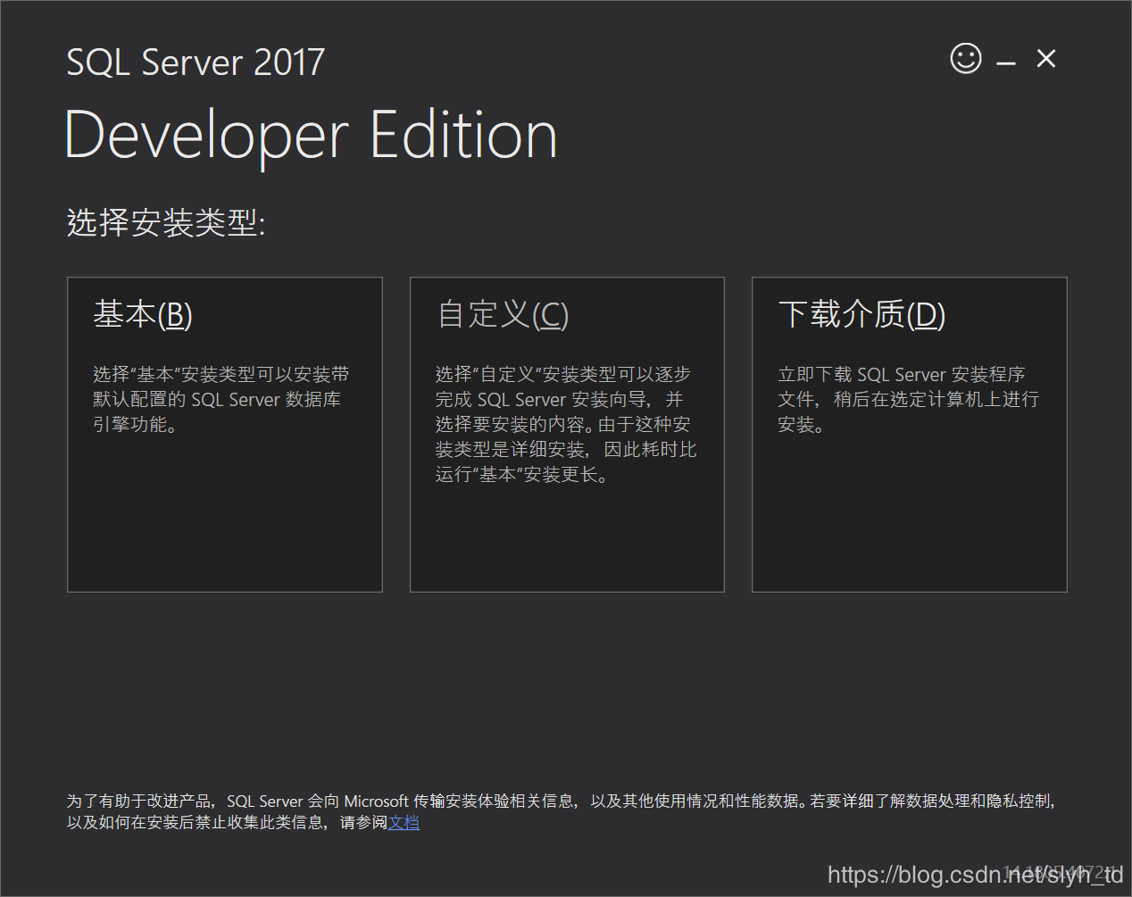 1.官網(wǎng)下載SQL Server 2017 Developer,打開安裝軟件,選擇自定義