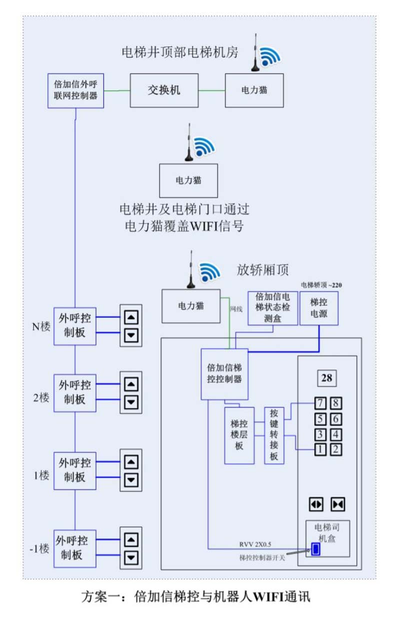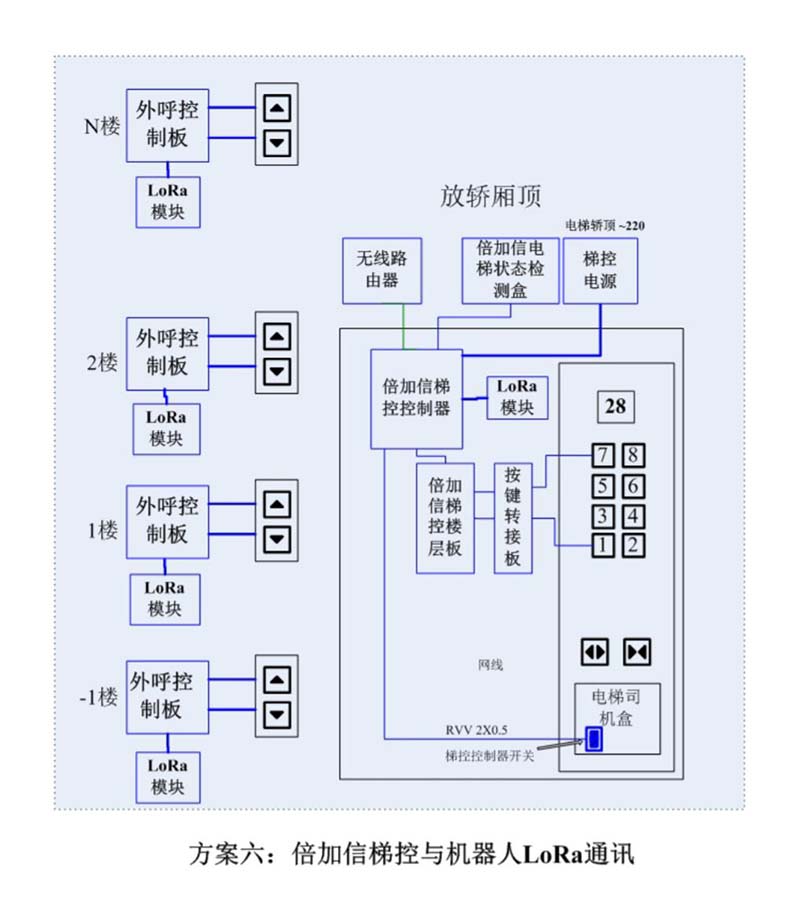 (1)機器人在電梯外,通個Wifi、藍牙、LoRa、Zigbee、2.4G、433M、語音或4G網(wǎng)絡(luò)等發(fā)送指令倍加信梯控系統(tǒng),系統(tǒng)自動點亮上樓或下樓按鍵,實現(xiàn)呼梯功能。