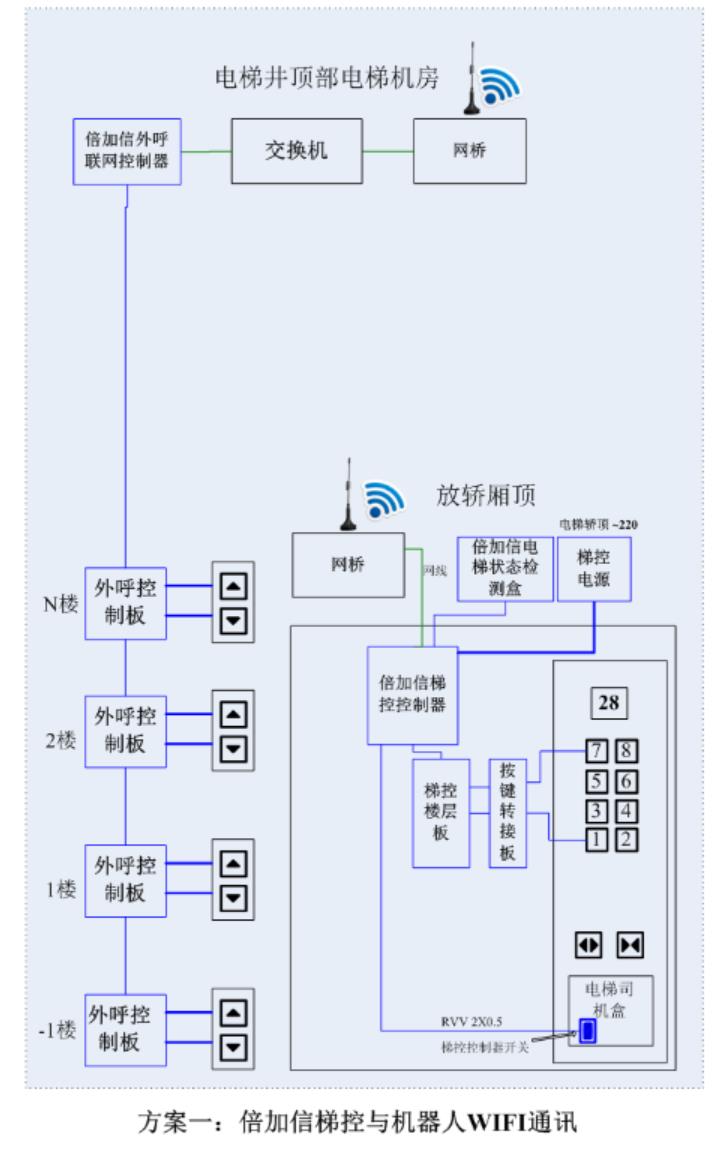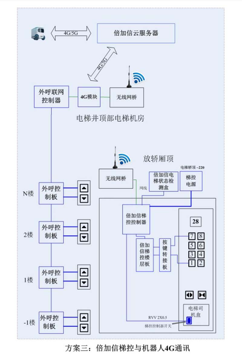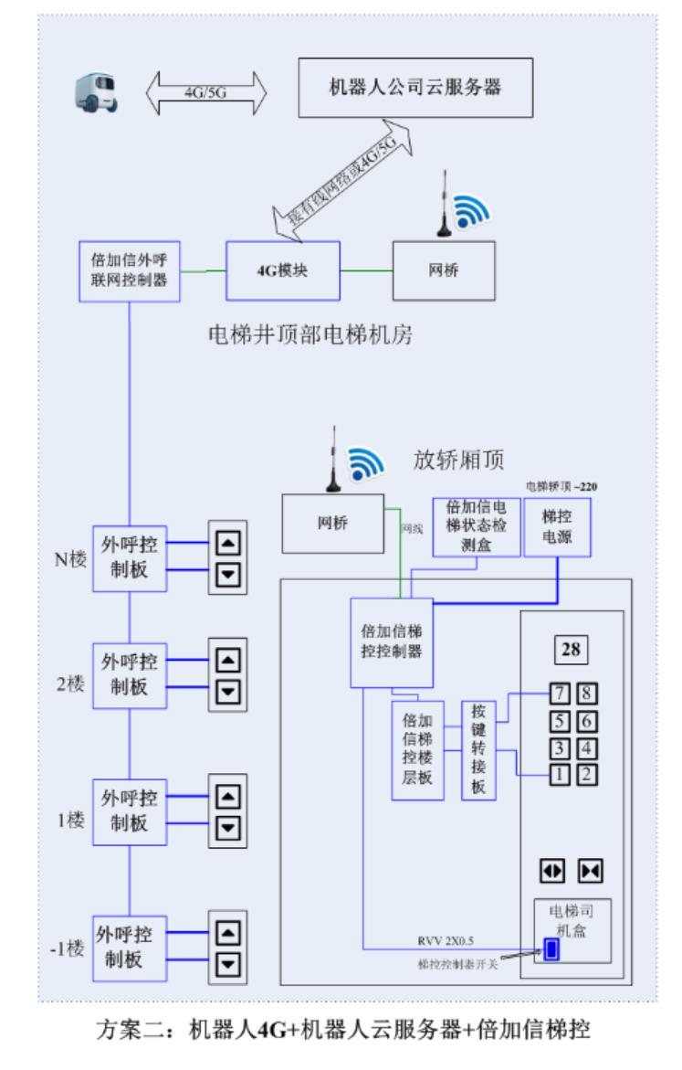 (1)機器人在電梯外,通個Wifi或4G網(wǎng)絡(luò)發(fā)送指令給倍加信梯控平臺,倍加信梯控云平臺收到指令后,將指令發(fā)給倍加信梯控系統(tǒng),倍加信梯控系統(tǒng)自動點亮上樓或下樓按鍵,實現(xiàn)呼梯功能。