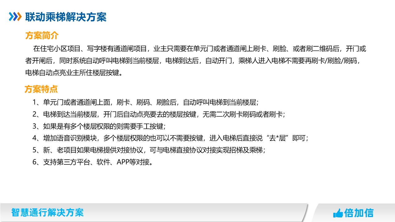 在住宅小區項目、寫字樓有通道閘項目,業主只需要在單元門或者通道閘上刷卡、刷臉、或者刷二維碼后,開門或者開閘后,同時系統自動呼叫電梯到當前樓層,電梯到達后,自動開門,乘梯人進入電梯不需要再刷卡/刷臉/刷碼,電梯自動點亮業主所住樓層按鍵。