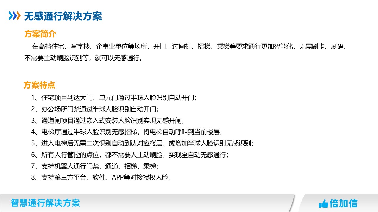 在高檔住宅、寫(xiě)字樓、企事業(yè)單位等場(chǎng)所,開(kāi)門(mén)、過(guò)閘機(jī)、招梯、乘梯等要求通行更加智能化,無(wú)需刷卡、刷碼、不需要主動(dòng)刷臉識(shí)別等,就可以無(wú)感通行。