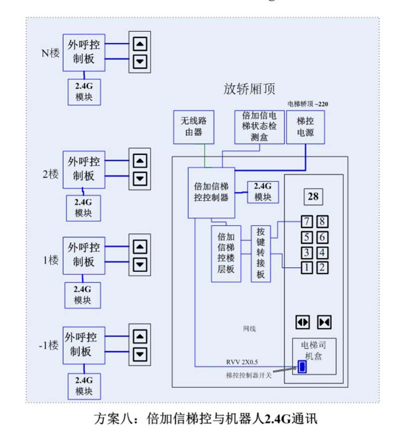 (1)機(jī)器人在電梯外,通過2.4G通訊發(fā)送指令倍加信梯控系統(tǒng),系統(tǒng)自動點(diǎn)亮上樓或下樓按鍵,實(shí)現(xiàn)呼梯功能。