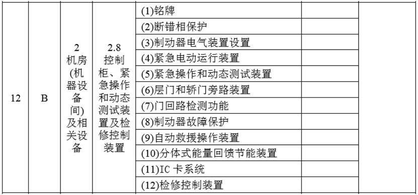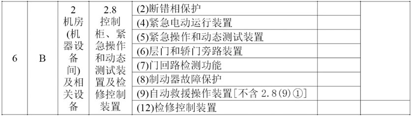 (4)將2.8項的項目及類別調整為“控制柜、緊急操作和動態測試裝置及檢修控制裝置B”,在檢驗內容與要求中增加: