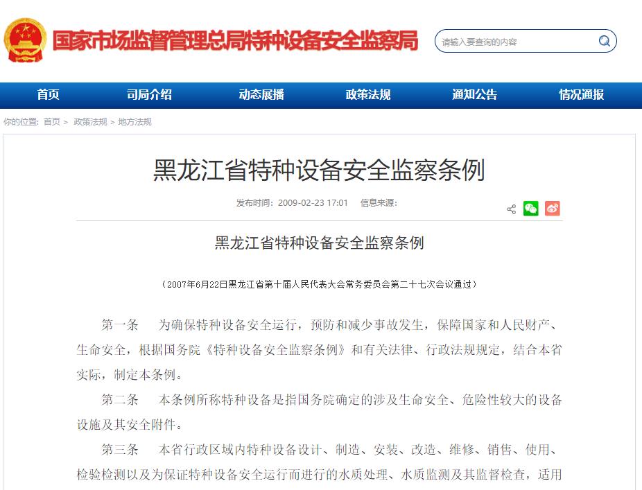 《黑龍江省特種設備安全監察條例》2007年6月22日黑龍江省第十屆人民代表大會常務委員會第二十七次會議通過